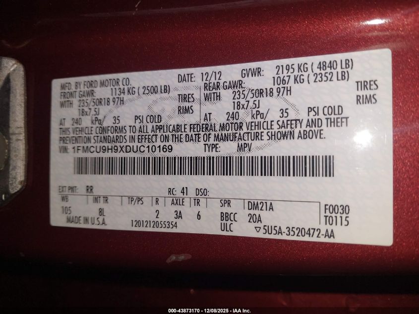 Колір ЧервонийЦиліндри 4Привід Повний привідVIN 1FMCU9H9XDUC10169Стан Заводиться та їде (перевірено)Ушкодження Передня або задня AutoRIA
