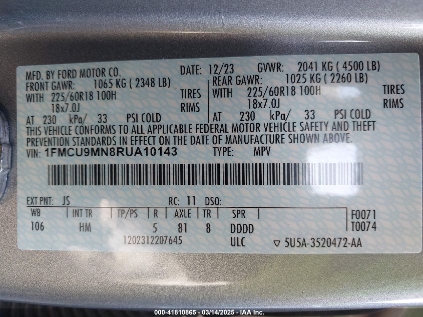 2024 FORD ESCAPE 2024 року Бензин, 1.5, Повний привід, vin - 1FMCU9MN8RU****** з США