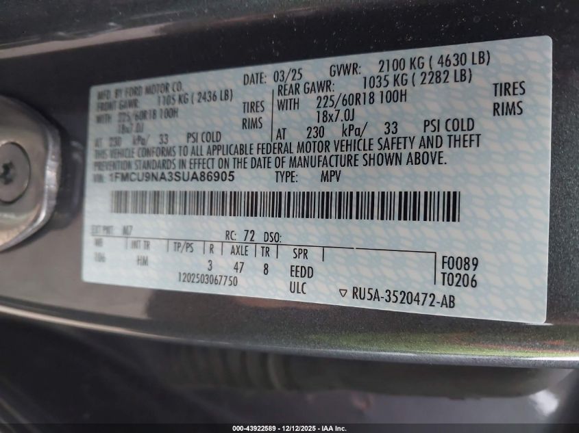 2025 FORD ESCAPE 2025 року Бензин, 2.0, Повний привід, vin - 1FMCU9NA3SUA86905 з США