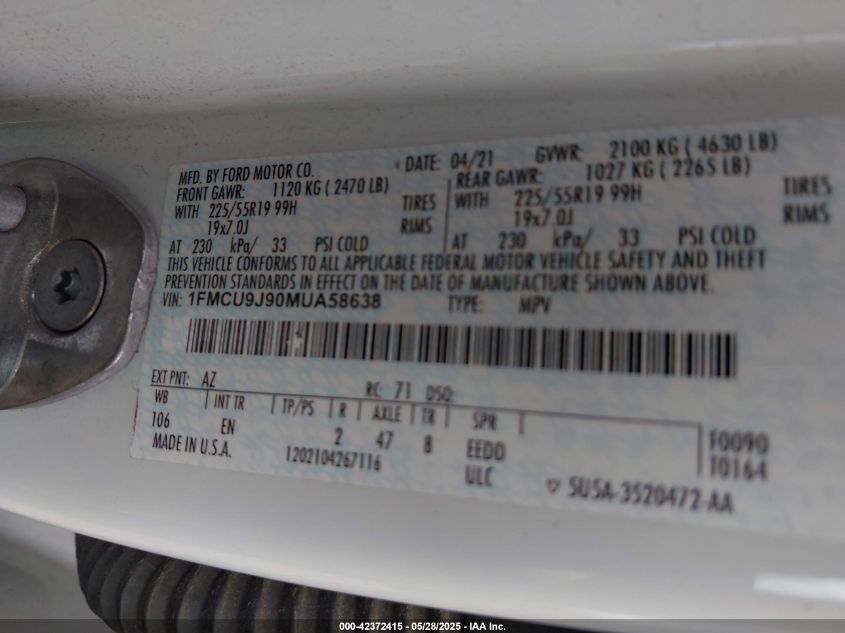 2021 FORD ESCAPE 2021 року Бензин, 2.0, Повний привід, vin - 1FMCU9J90MU****** з США