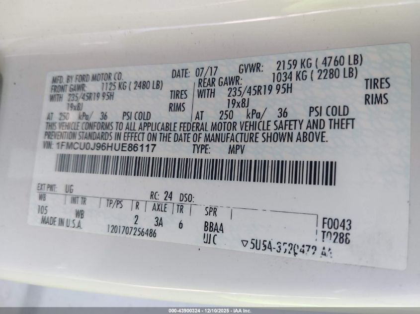 2017 FORD ESCAPE 2017 року Бензин, 2.0, Передній привід, vin - 1FMCU0J96HUE86117 з США