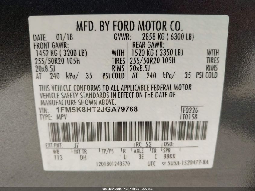 Колір СірийЦиліндри 6Привід Повний привідVIN 1FM5K8HT2JGA79768Стан Заводиться та їде (перевірено)Ушкодження Права сторона AutoRIA