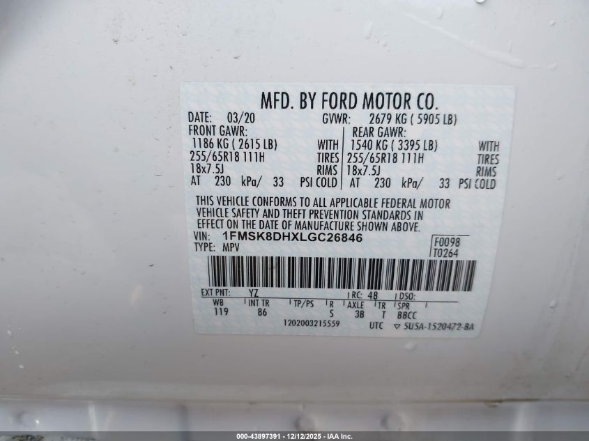 Колір БілийЦиліндри 4Привід Повний привідVIN 1FMSK8DHXLGC26846Стан Заводиться та їде (перевірено)Ушкодження Задня AutoRIA