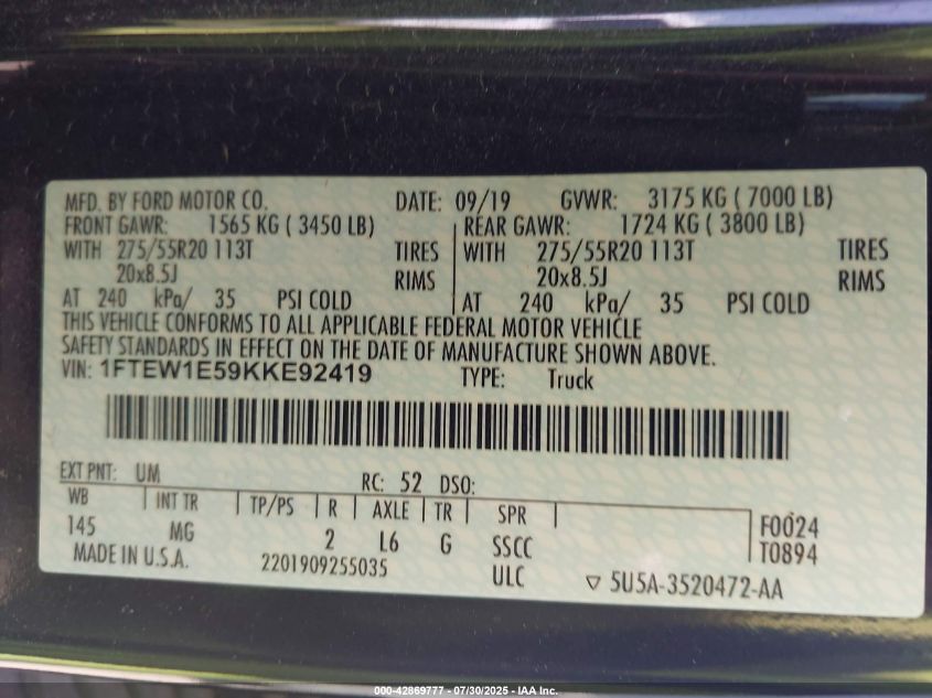Колір ЧорнийЦиліндри 8Привід Повний привідVIN 1FTEW1E59KK******Стан НевідомоУшкодження Передня або задняДата аукціону 2025-09-17