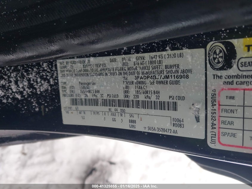 Колір ЧорнийЦиліндри 4Привід Передній привідVIN 3FADP4BJ7JM******Стан НевідомоУшкодження Передня або задняДата аукціону 2025-07-01