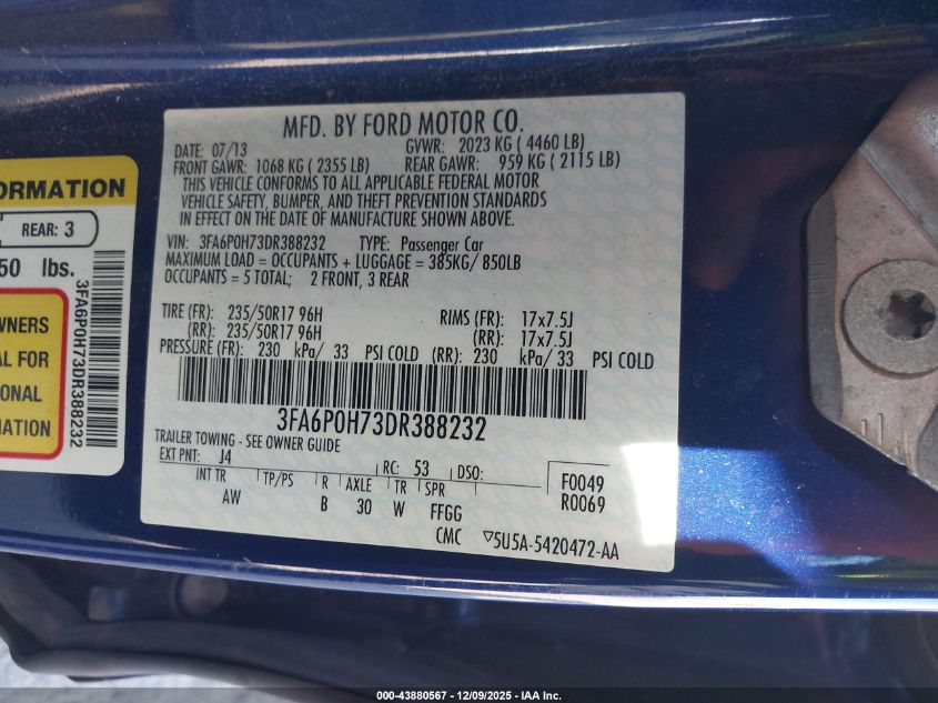 Колір СинійЦиліндри 4Привід Передній привідVIN 3FA6P0H73DR388232Стан Заводиться та їде (перевірено)Ушкодження Передня або задня AutoRIA