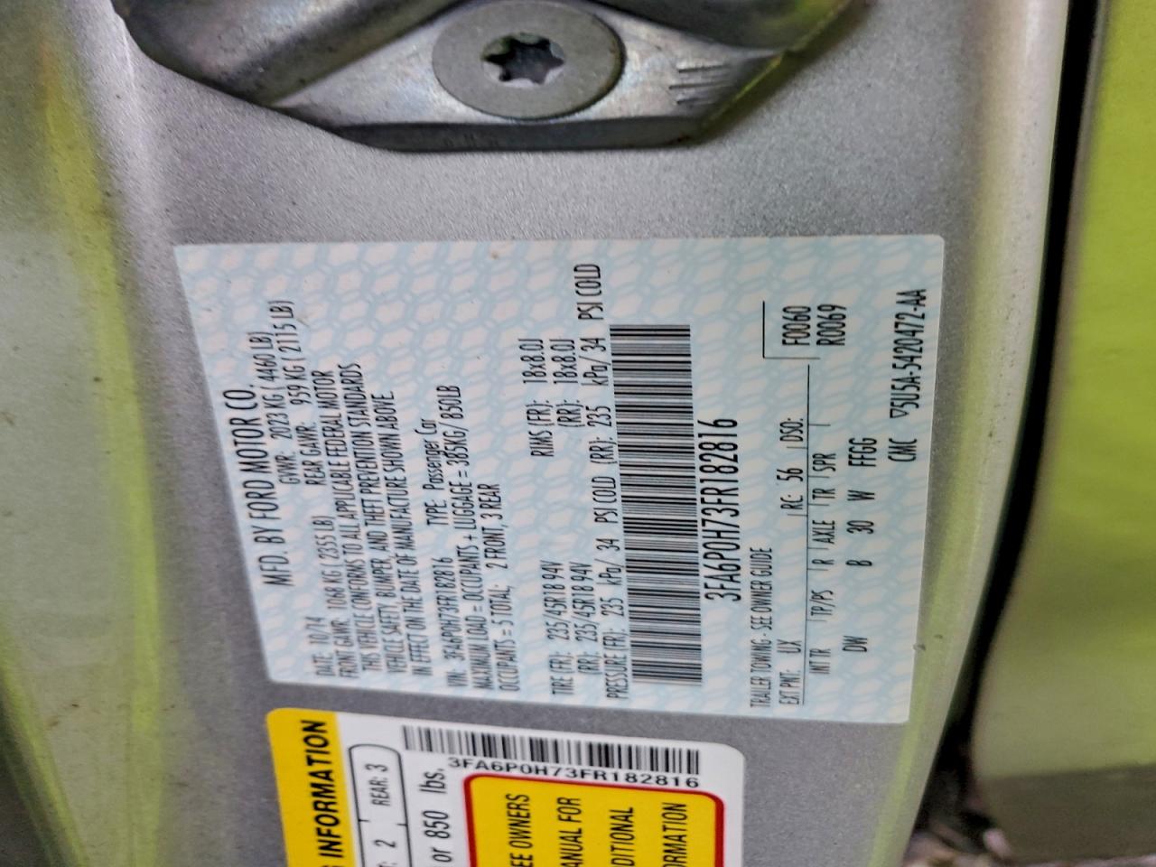 Колір СрібнийЦиліндри 4VIN 3FA6P0H73FR182816Стан Заводиться та їде (перевірено)Ушкодження З боківДата аукціону 2025-12-16