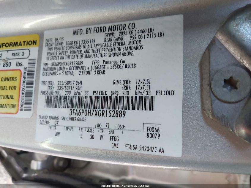 2016 FORD FUSION 2016 року Бензин, 2.5, Передній привід, vin - 3FA6P0H7XGR152889 з США
