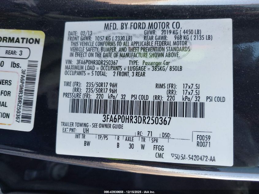 2013 FORD FUSION 2013 року Бензин, 1.6, Передній привід, vin - 3FA6P0HR3DR250367 з США