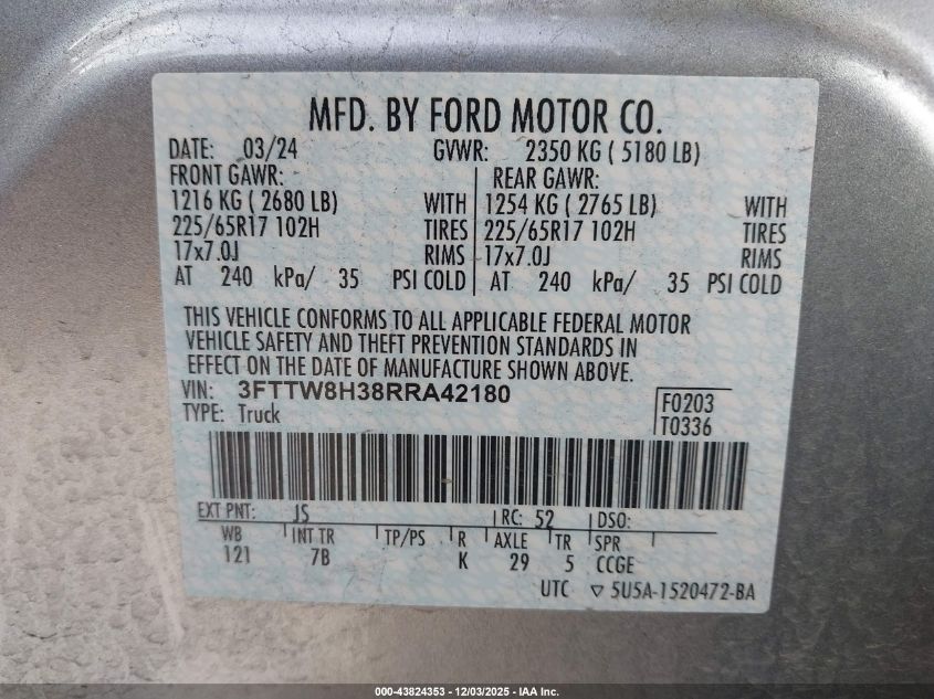 2024 FORD MAVERICK 2024 року Гібрид, 2.5, Передній привід, vin - 3FTTW8H38RRA42180 з США