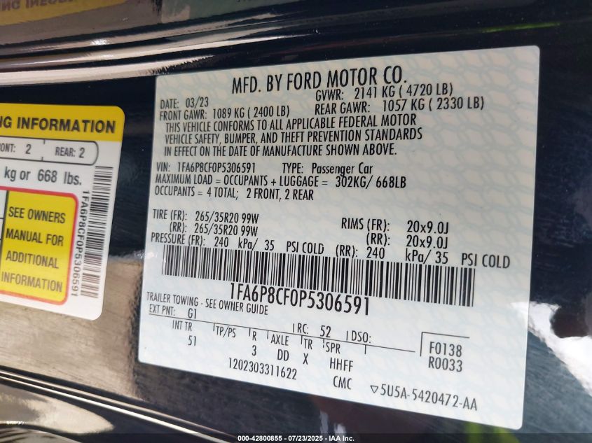 2023 FORD MUSTANG 2023 року Бензин, 5.0, Задній привід, vin - 1FA6P8CF0P5306591 з США