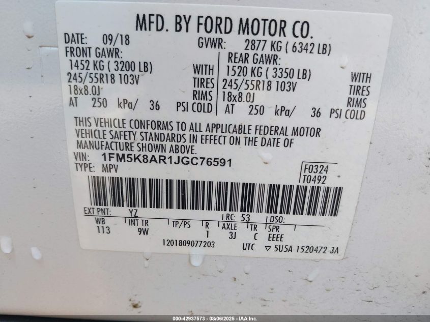Колір БілийЦиліндри 6Привід Повний привідVIN 1FM5K8AR1JG******Стан НевідомоУшкодження Передня або задняДата аукціону 2025-09-22