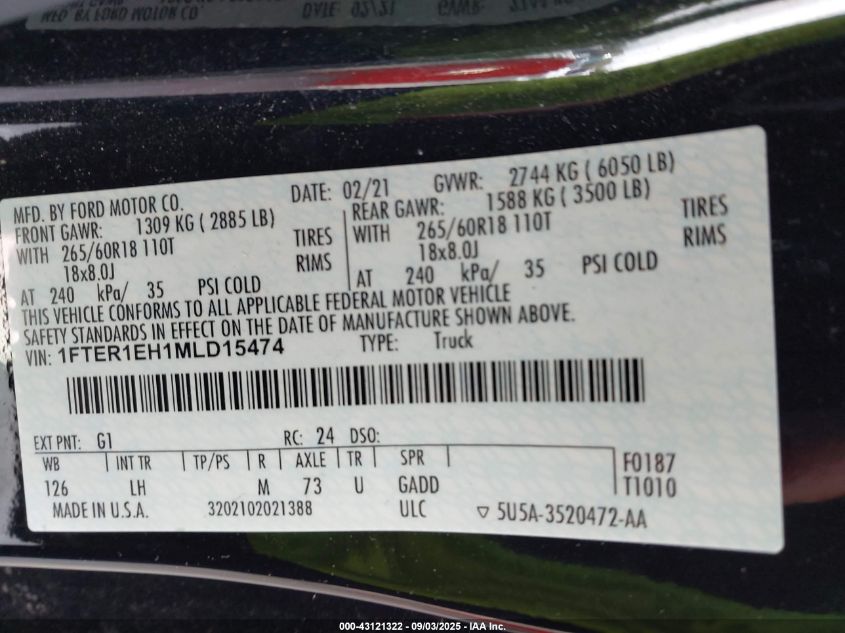 2021 FORD RANGER 2021 року Бензин, 2.3, , vin - 1FTER1EH1ML****** з США