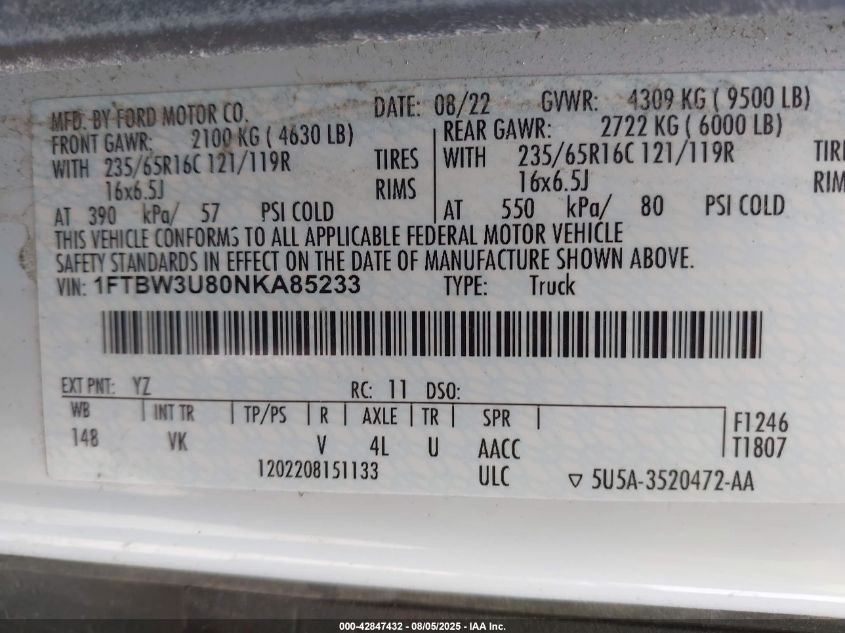 Колір БілийЦиліндри 6Привід Повний привідVIN 1FTBW3U80NKA85233Стан СтаціонарноУшкодження Передня або задня AutoRIA