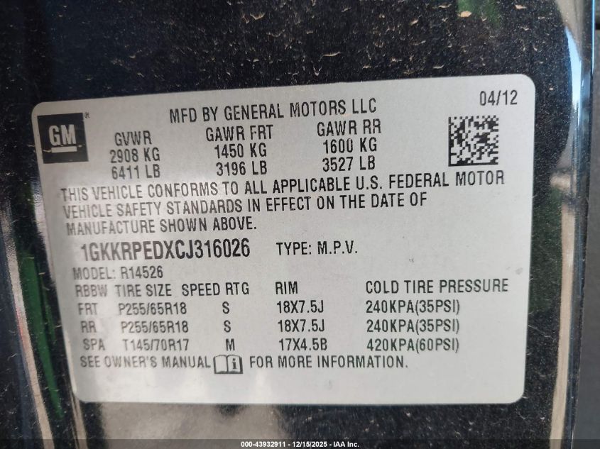 Колір Циліндри 6Привід Передній привідVIN 1GKKRPEDXCJ316026Стан НевідомоУшкодження Звичайний знос