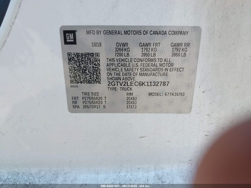 2019 GMC SIERRA 1500 2019 року Бензин, 5.3, Повний привід, vin - 2GTV2LEC6K1****** з США