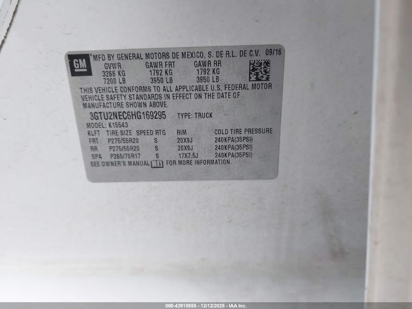 2017 GMC SIERRA 1500 2017 року Бензин, 5.3, Повний привід, vin - 3GTU2NEC6HG169295 з США