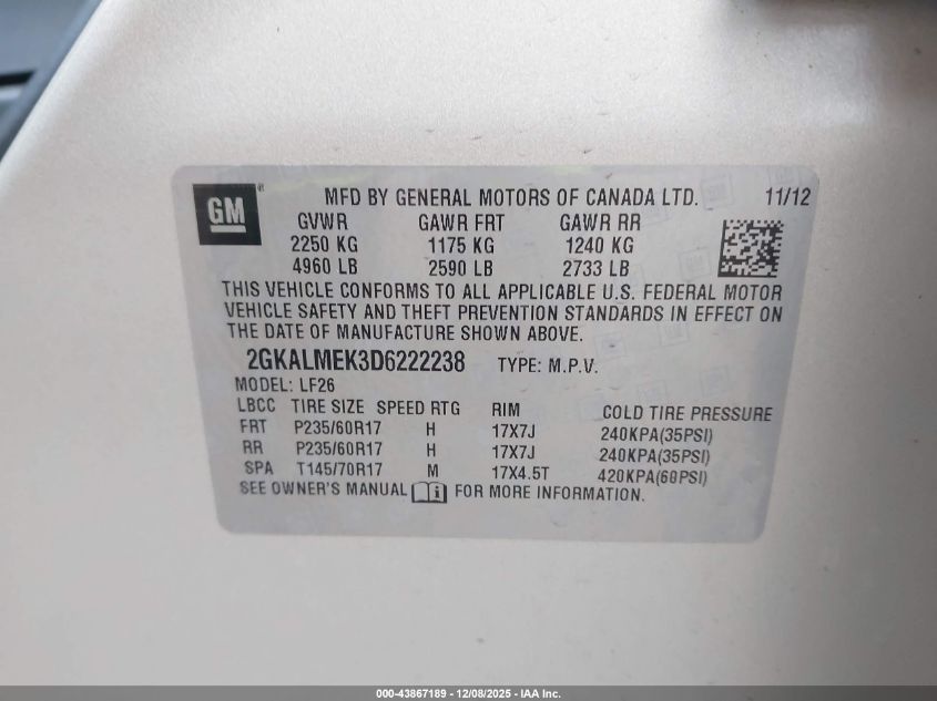 Колір БежевийЦиліндри 4Привід Передній привідVIN 2GKALMEK3D6222238Стан СтаціонарноУшкодження Передня або задня AutoRIA