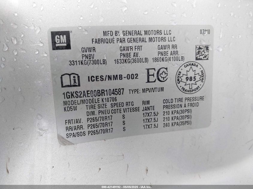 Колір СрібнийЦиліндри 8Привід Повний привідVIN 1GKS2AE00BR******Стан НевідомоУшкодження Передня або задняДата аукціону 2025-10-01