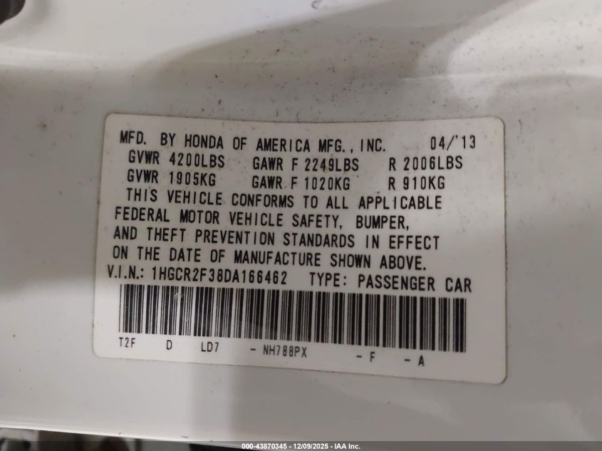 Колір БілийЦиліндри 4Привід Передній привідVIN 1HGCR2F38DA166462Стан СтаціонарноУшкодження Передня або задня AutoRIA