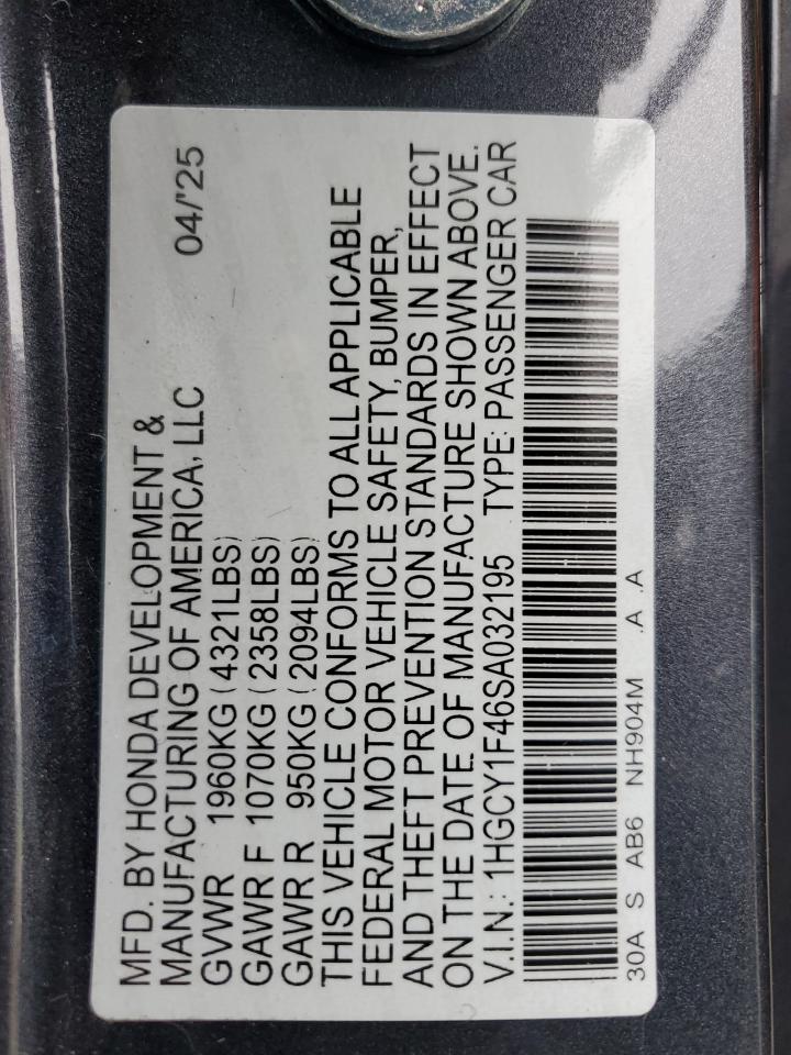 Колір СірийЦиліндри 4VIN 1HGCY1F46SA032195Стан Заводиться та їде (перевірено)Ушкодження ЗадняДата аукціону 2025-12-05 AutoRIA