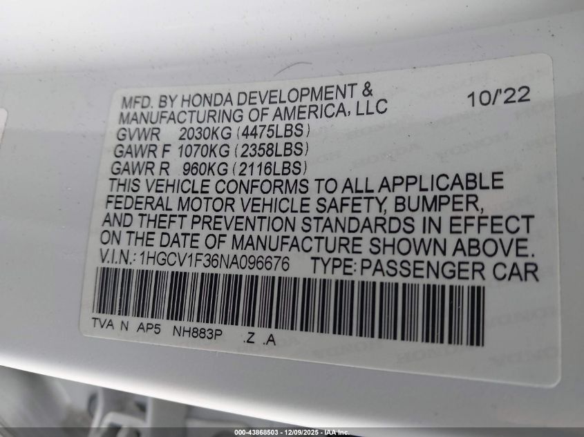 2022 HONDA ACCORD 2022 року Бензин, 1.5, Передній привід, vin - 1HGCV1F36NA096676 з США