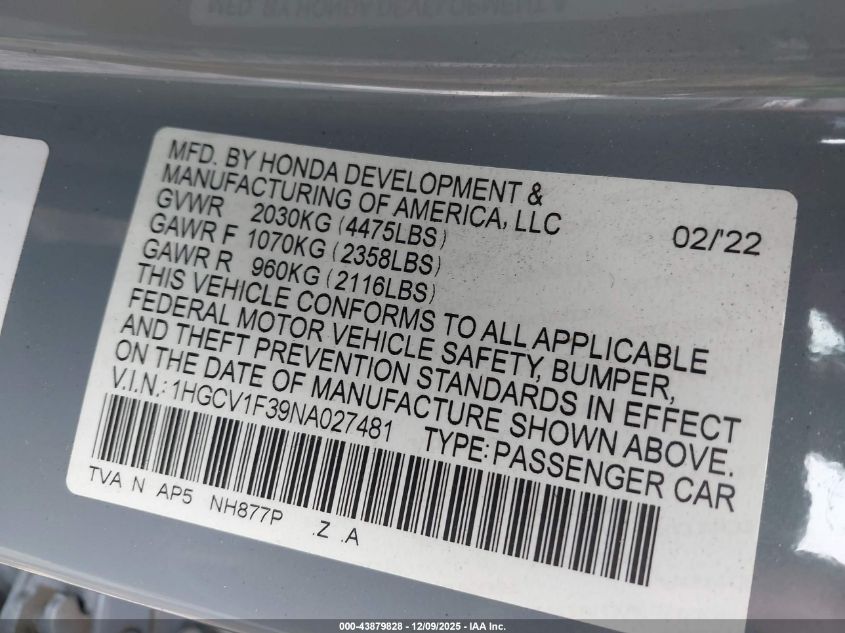 2022 HONDA ACCORD 2022 року Бензин, 1.5, Передній привід, vin - 1HGCV1F39NA027481 з США