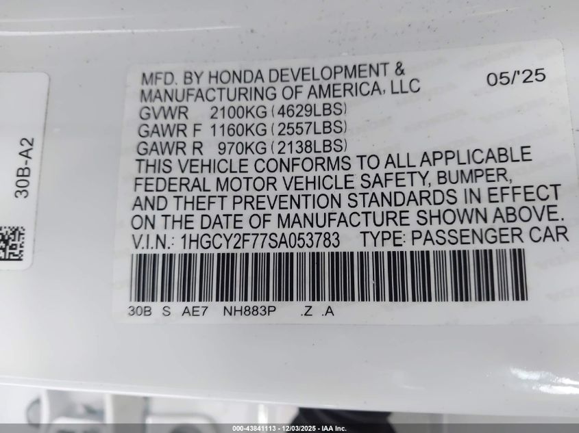2025 HONDA ACCORD 2025 року Гібрид, 2.0, Передній привід, vin - 1HGCY2F77SA053783 з США
