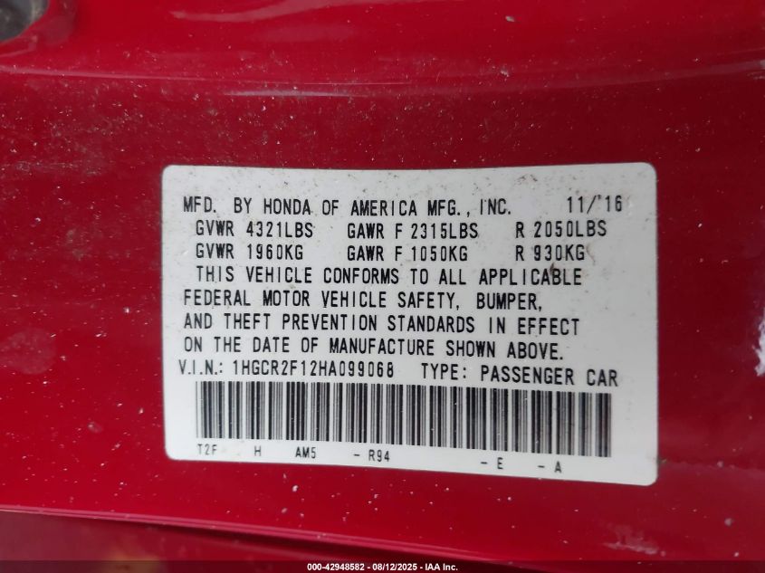 2017 HONDA ACCORD 2017 року Бензин, 2.4, Передній привід, vin - 1HGCR2F12HA099068 з США