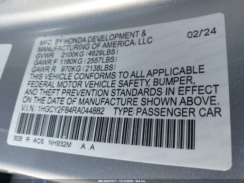 2024 HONDA ACCORD 2024 року Гібрид, 2.0, Передній привід, vin - 1HGCY2F84RA044882 з США