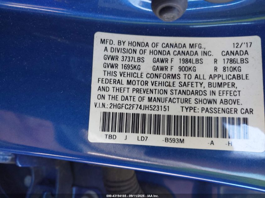 2018 HONDA CIVIC 2018 року Бензин, 2.0, Передній привід, vin - 2HGFC2F74JH523151 з США