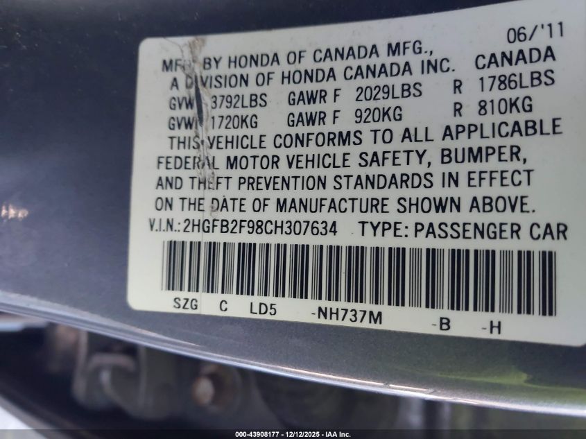 2012 HONDA CIVIC 2012 року Бензин, 1.8, Передній привід, vin - 2HGFB2F98CH307634 з США