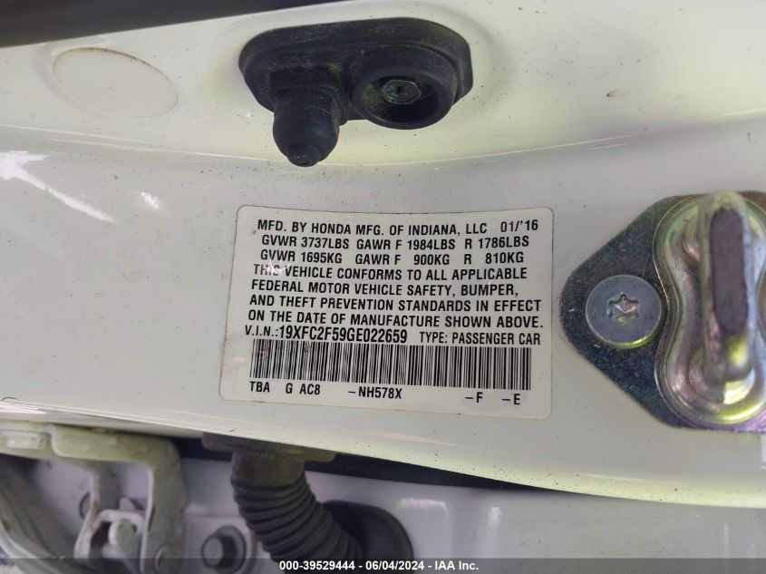 2016 HONDA CIVIC 2016 року Бензин, 2.0, Передній привід, vin - 19XFC2F59GE****** з США