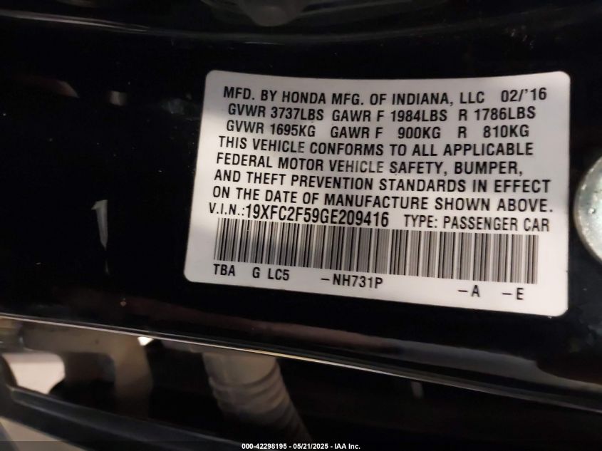 2016 HONDA CIVIC 2016 року Бензин, 2.0, Передній привід, vin - 19XFC2F59GE****** з США