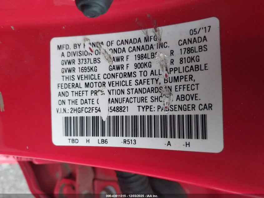 2017 HONDA CIVIC 2017 року Бензин, 2.0, Передній привід, vin - 2HGFC2F54HH548821 з США