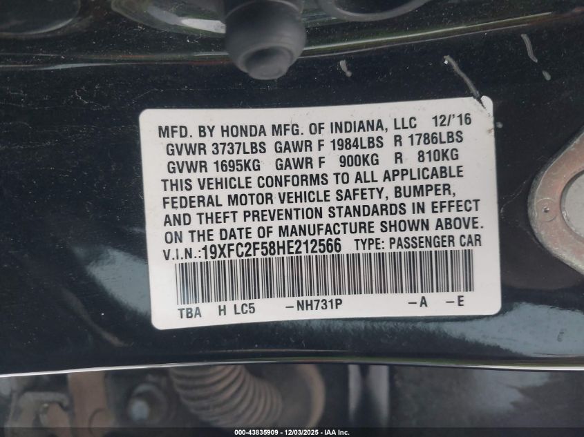 2017 HONDA CIVIC 2017 року Бензин, 2.0, Передній привід, vin - 19XFC2F58HE212566 з США