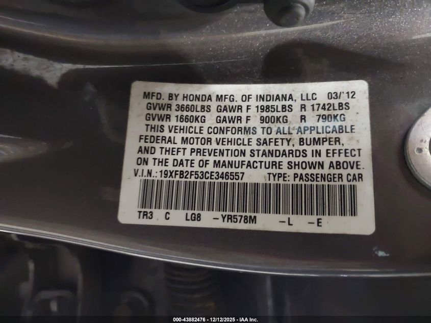 2012 HONDA CIVIC 2012 року Бензин, 1.8, Передній привід, vin - 19XFB2F53CE346557 з США