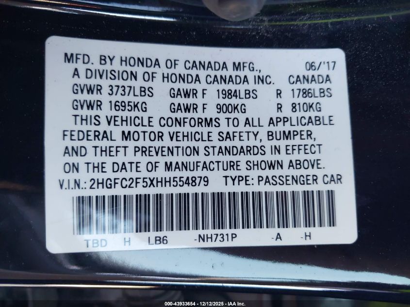 2017 HONDA CIVIC 2017 року Бензин, 2.0, Передній привід, vin - 2HGFC2F5XHH554879 з США