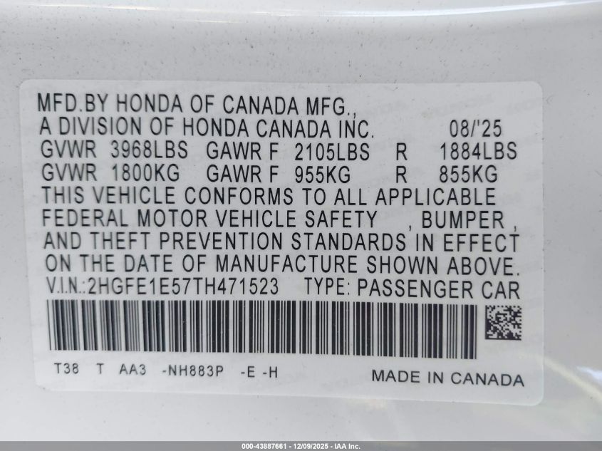 2026 HONDA CIVIC 2026 року Бензин, 1.5, Передній привід, vin - 2HGFE1E57TH471523 з США