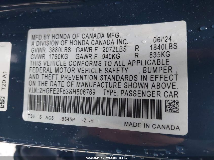 2025 HONDA CIVIC 2025 року Бензин, 2.0, Передній привід, vin - 2HGFE2F53SH506769 з США
