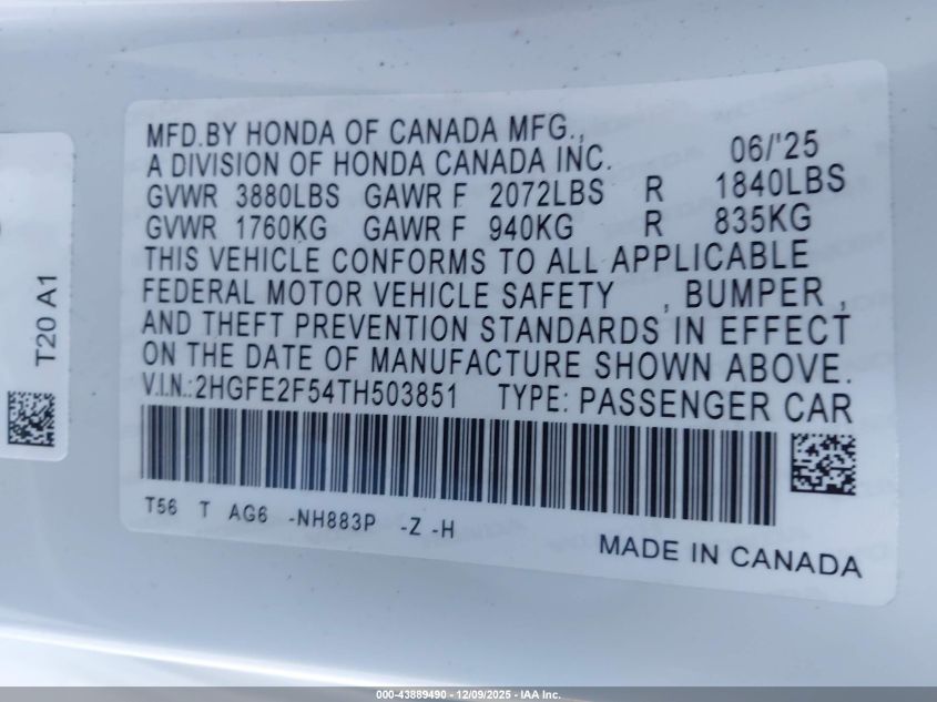2026 HONDA CIVIC 2026 року Бензин, 2.0, Передній привід, vin - 2HGFE2F54TH503851 з США