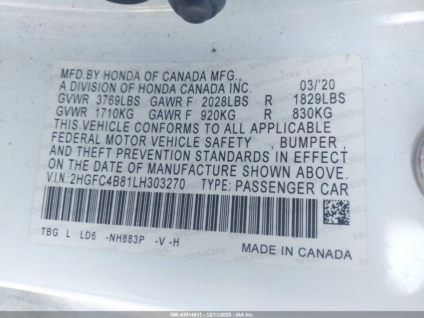 2020 HONDA CIVIC 2020 року Бензин, 2.0, Передній привід, vin - 2HGFC4B81LH303270 з США