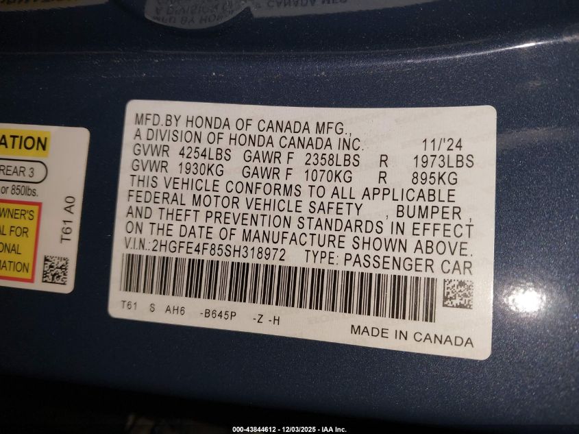 2025 HONDA CIVIC 2025 року Гібрид, 2.0, Передній привід, vin - 2HGFE4F85SH318972 з США