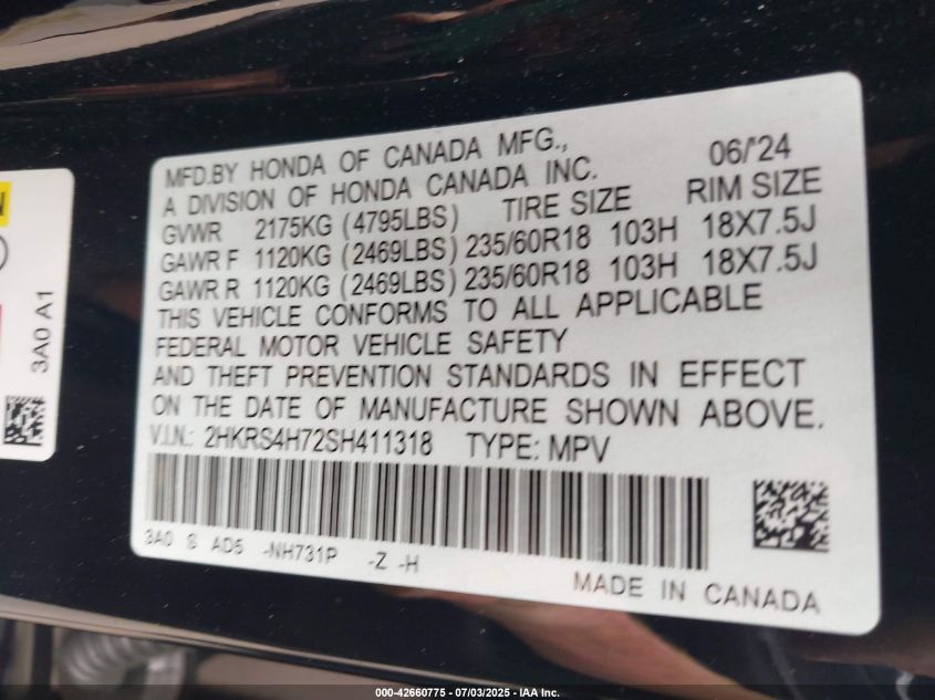 2025 HONDA CR-V 2025 року Бензин, 1.5, Повний привід, vin - 2HKRS4H72SH411318 з США