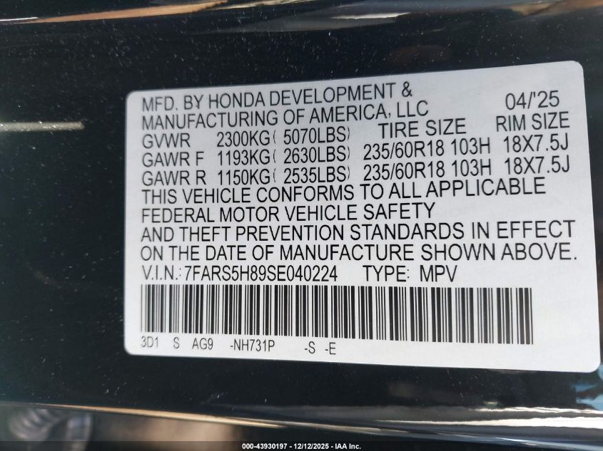 2025 HONDA CR-V HYBRID 2025 року Гібрид, 2.0, Передній привід, vin - 7FARS5H89SE040224 з США