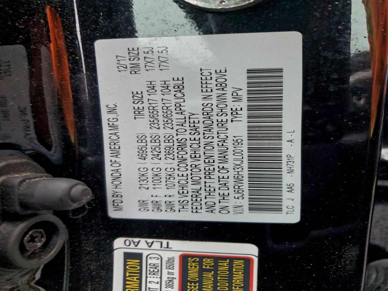 2018 HONDA CR-V 2018 року Бензин, 2.4, Повний привід, vin - 5J6RW6H3XJL001951 з США