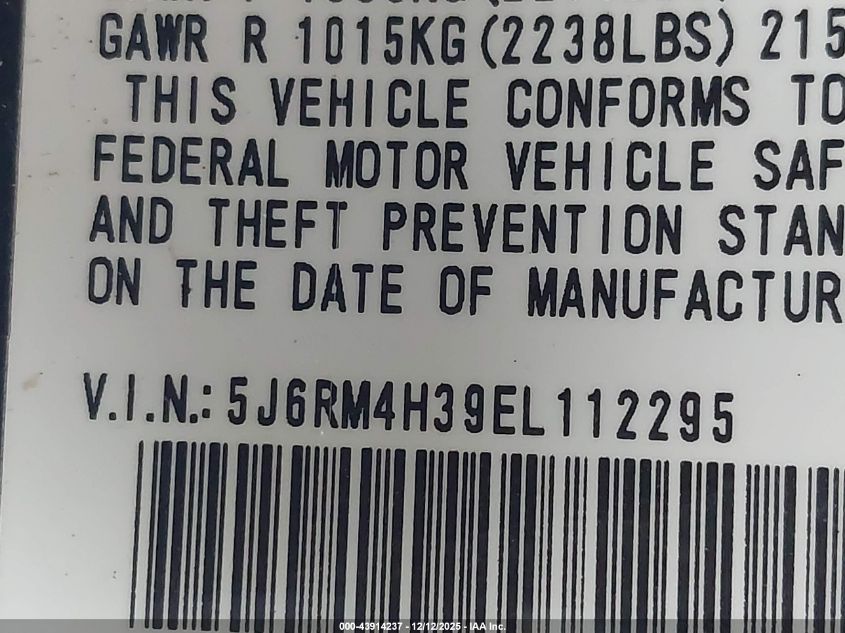 Колір ЧорнийЦиліндри 4Привід Повний привідVIN 5J6RM4H39EL112295Стан Заводиться та їде (перевірено)Ушкодження Передня або задня AutoRIA
