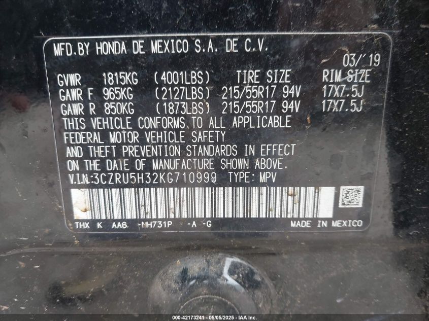 2019 HONDA HR-V 2019 року Бензин, 1.8, Передній привід, vin - 3CZRU5H32KG****** з США