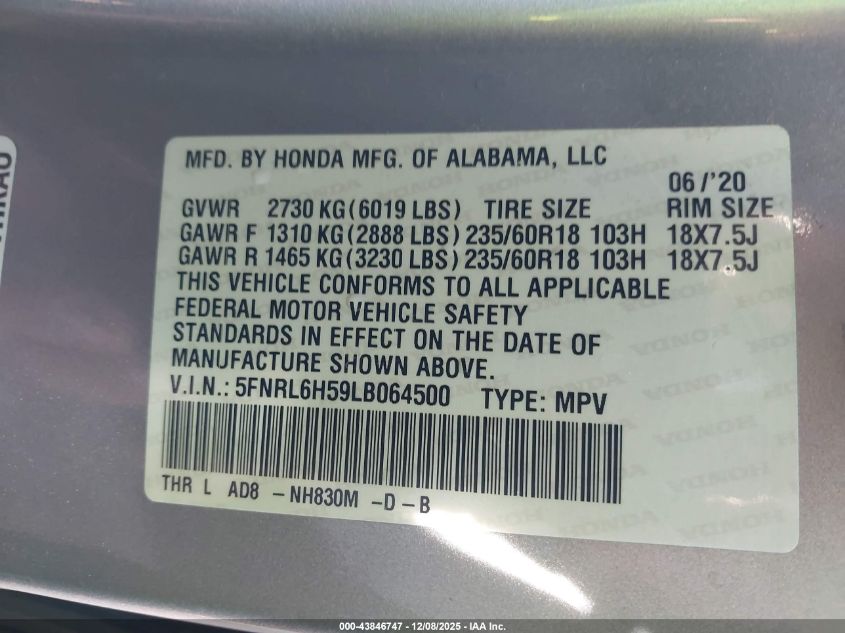 2020 HONDA ODYSSEY 2020 року Бензин, 3.5, Передній привід, vin - 5FNRL6H59LB064500 з США