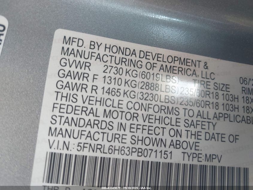 2023 HONDA ODYSSEY 2023 року Бензин, 3.5, Передній привід, vin - 5FNRL6H63PB071151 з США